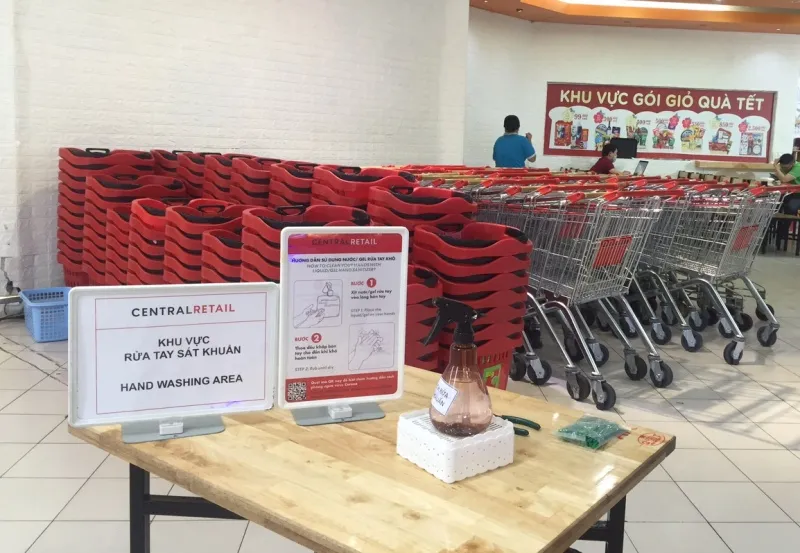 Tại cổng vào siêu thị có khu vực rửa tay sát khuẩn cho người tiêu dùng.