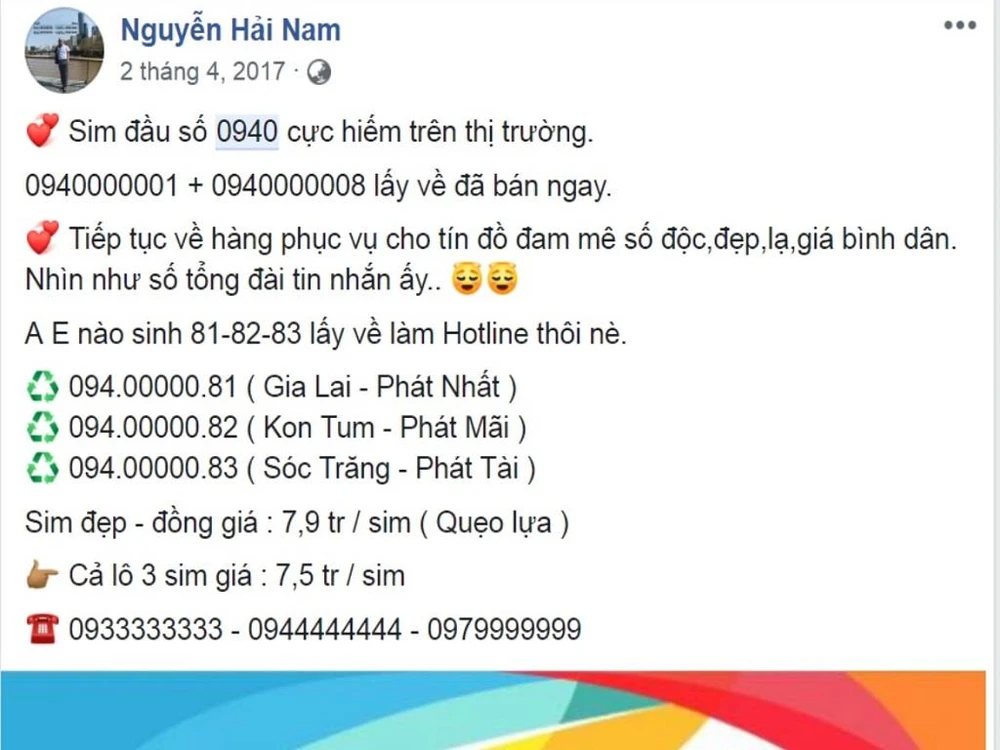 Một trang facebook cá nhân mang tên Nguyễn Hải Nam rao vào ngày 2-4-2017 "sim đầu số 0940 cực hiếm trên thị trường, 0940000001 + 0940000008, lấy về đã bán ngay".