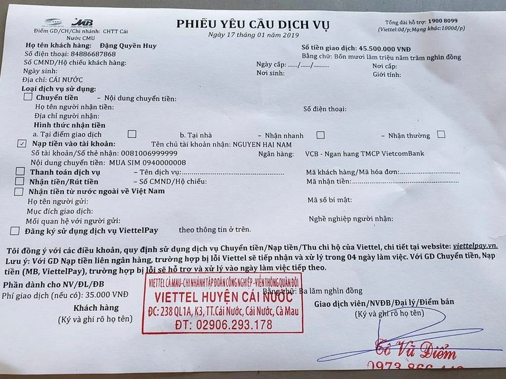 Tương tự, anh Đặng Quyền Huy ở Cái Nước cho hay: "Tôi thích sim hiếm nên đã mua 4 con đầu số 0940 giá mấy trăm triệu đồng. Nay nghe Vinaphone thu hồi quá bức xúc". Anh đã đưa cho chúng tôi xem một chứng từ mua một sim với giá 45 triệu đồng. Con sim có dãy số 0940000008.