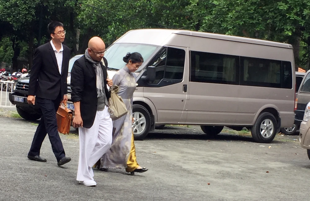 Ông Vũ cùng đại diện và luật sư trong một lần đến tòa giải quyết vụ ly hôn. Ảnh: HY