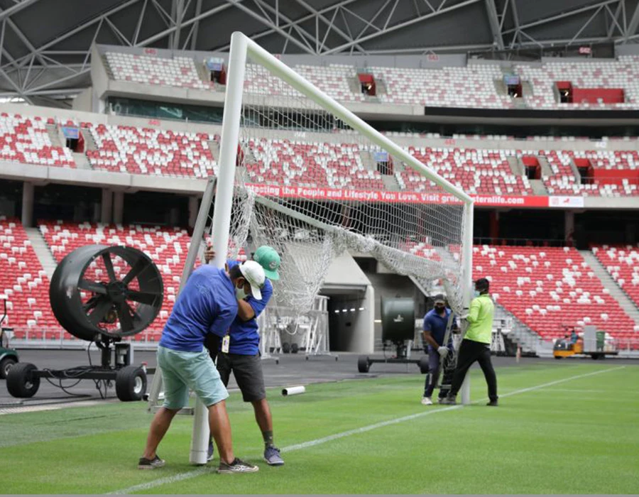 Các nhân viên hoàn tất khâu chuẩn bị cuối cùng cho AFF Cup trên sân vận động quốc gia Singapore. Ảnh: NST