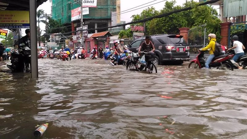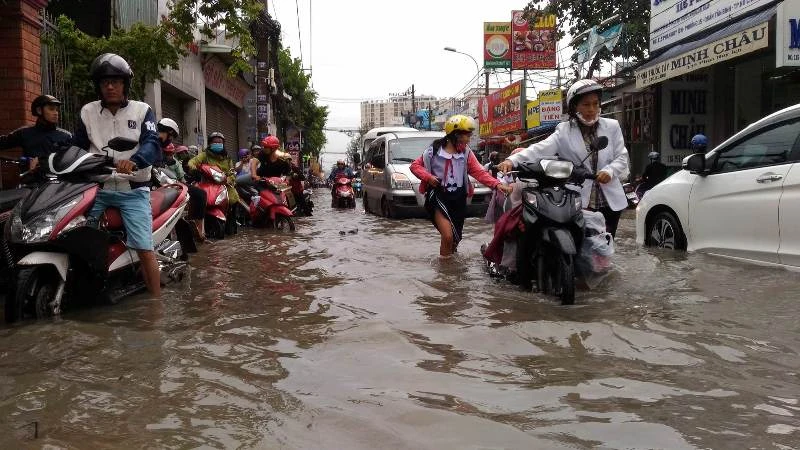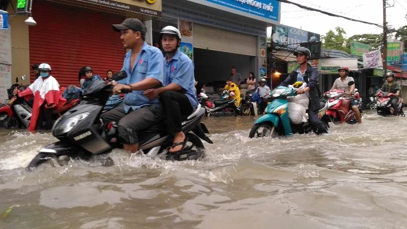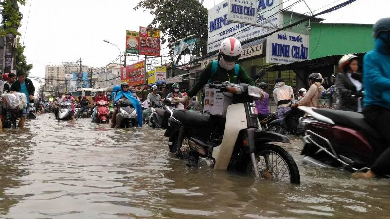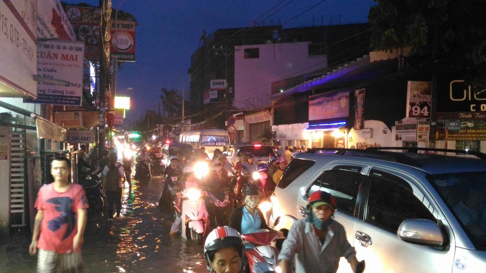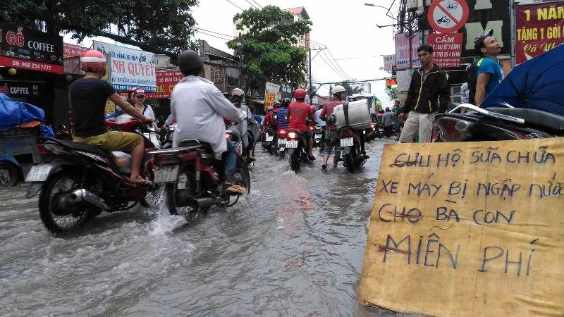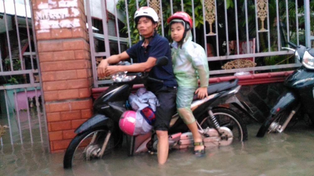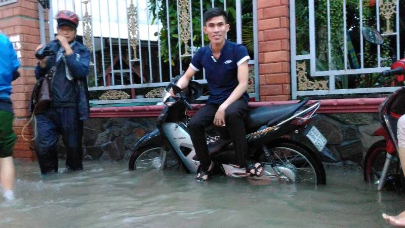 Anh Đỗ Văn Mạnh (ngụ phường 14, quận Gò Vấp) cho biết đi làm tại KCN Tân Bình về lúc 17 giờ nhưng phải tấp vào lề đường đứng do nước lớn và sợ xe chết máy.