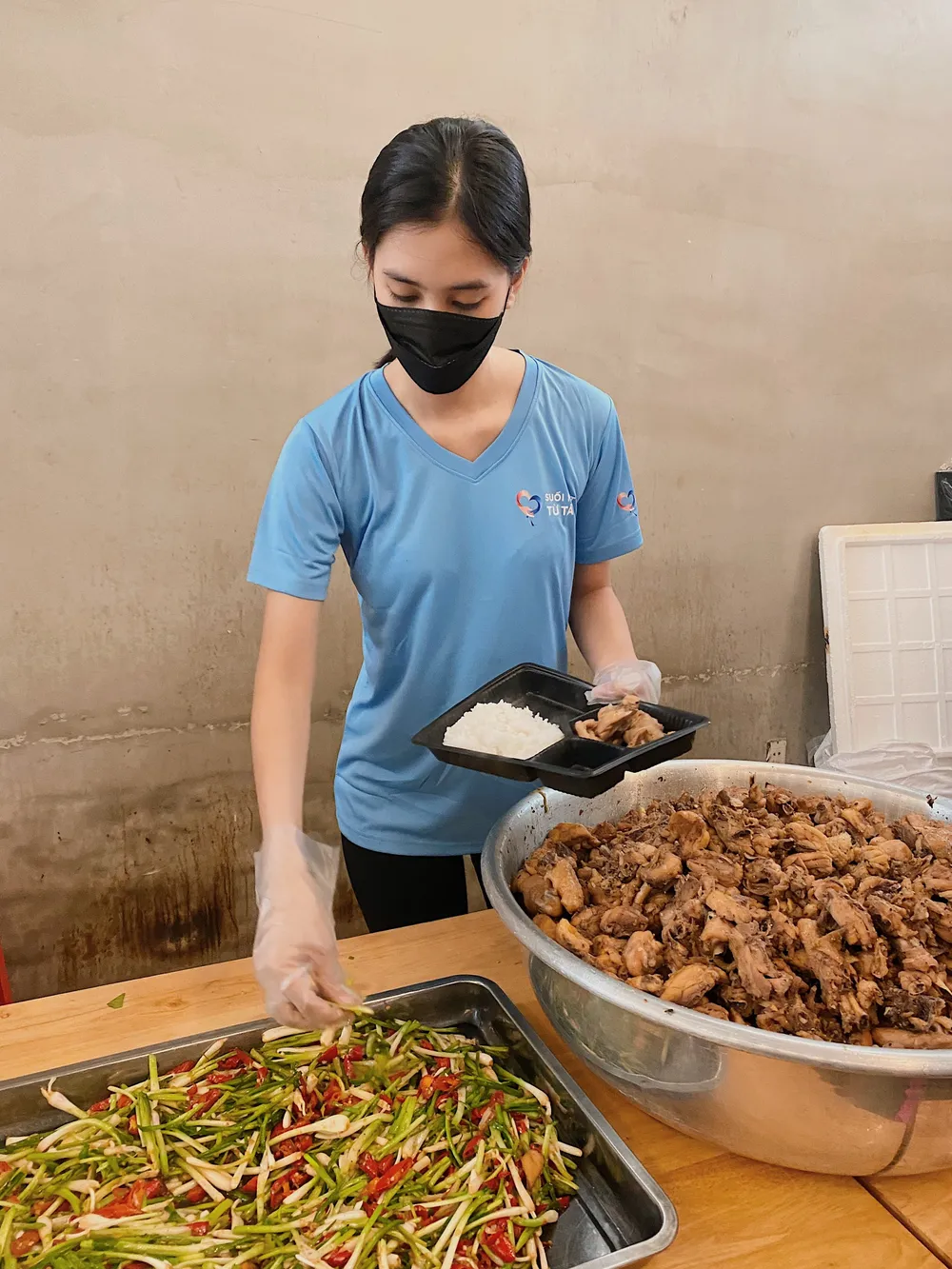 Hoa hậu Tiểu Vy nấu suất cơm cho tuyến đầu phòng dịch. Ảnh: SV