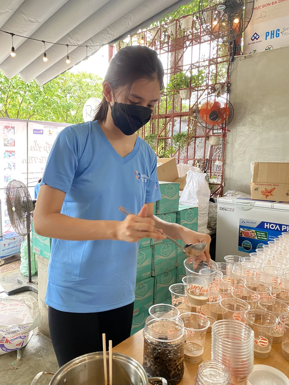 Với tài năng nấu nướng của mình, người đẹp không ngại trổ tài để nấu 1.500 suất cơm gà chiên nước mắm trong ngày đặc biệt này. Cô còn tự tay làm trà sữa để chiêu đãi các thành viên bếp trong giờ nghỉ trưa.