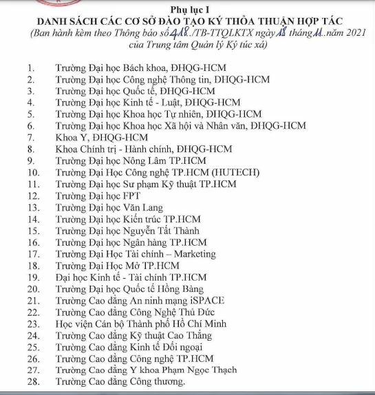 Danh sách 28 trường ĐH có sinh viên được nội trú tại KTX ĐHQG TP.HCM
