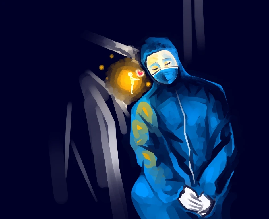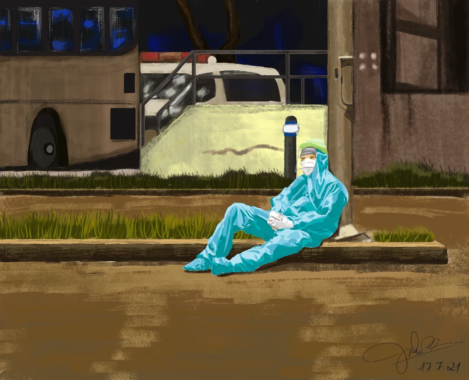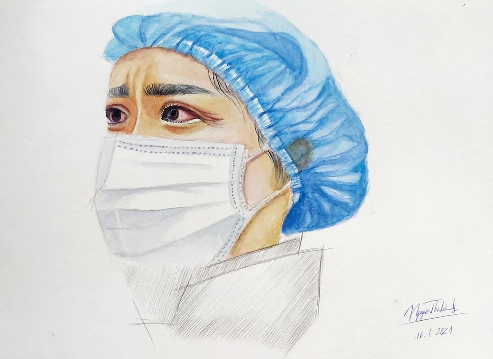 Hình ảnh mệt nhòa của chiến sĩ tuyến đầu chống dịch hiện lên trong tranh