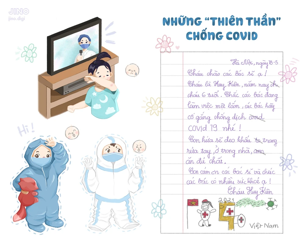 Hoàng Duy còn cho biết thêm: “Trong bức tranh của mình còn có lá thư của em Kiên, tuy chỉ mới 6 tuổi nhưng em đã biết thể hiện lòng biết ơn đối với các bác sĩ đã âm thầm bảo vệ em trong những ngày ở khu cách ly. Mỗi hình ảnh, mỗi câu chuyện trong tranh mình vẽ đều mang đến một thông điệp tích cực và ý nghĩa. Đặc biệt, hình ảnh đẹp đẽ trong lòng mình chính là hình ảnh những em bé cũng đang chung tay cùng đất nước đẩy lùi dịch bệnh”.