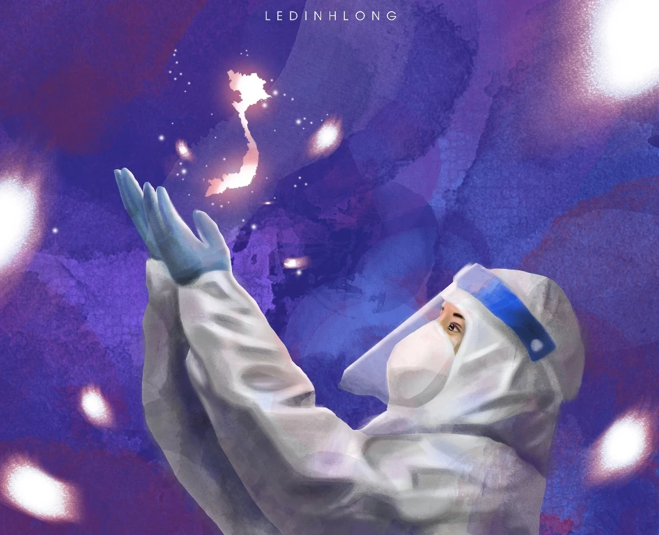 Mình thực hiện bức vẽ này bằng các thao tác trên máy tính. Mỗi hình tượng trong tranh mình vẽ đều mang một câu chuyện riêng. Mạng xã hội những ngày qua đều cảm thông khi nhìn thấy khoảnh khắc em bé đang oà khóc vì nhìn thấy mẹ của mình trên tivi đang chống dịch ở tuyến đầu mà lâu ngày rồi chưa về thăm em. Bên cạnh đó là hình ảnh những em bé khoác lên mình bộ đồ bảo hộ rộng thênh thang nhưng vẫn ngây thơ và đáng yêu” – Hoàng Duy tâm sự.