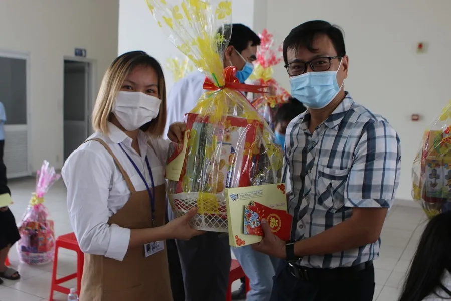 Sinh viên ở KTX ĐH Quốc gia TP.HCM được tặng quà và lì xì khi ở lại đón tết trong KTX. Ảnh: TTQLKTX ĐHQG
