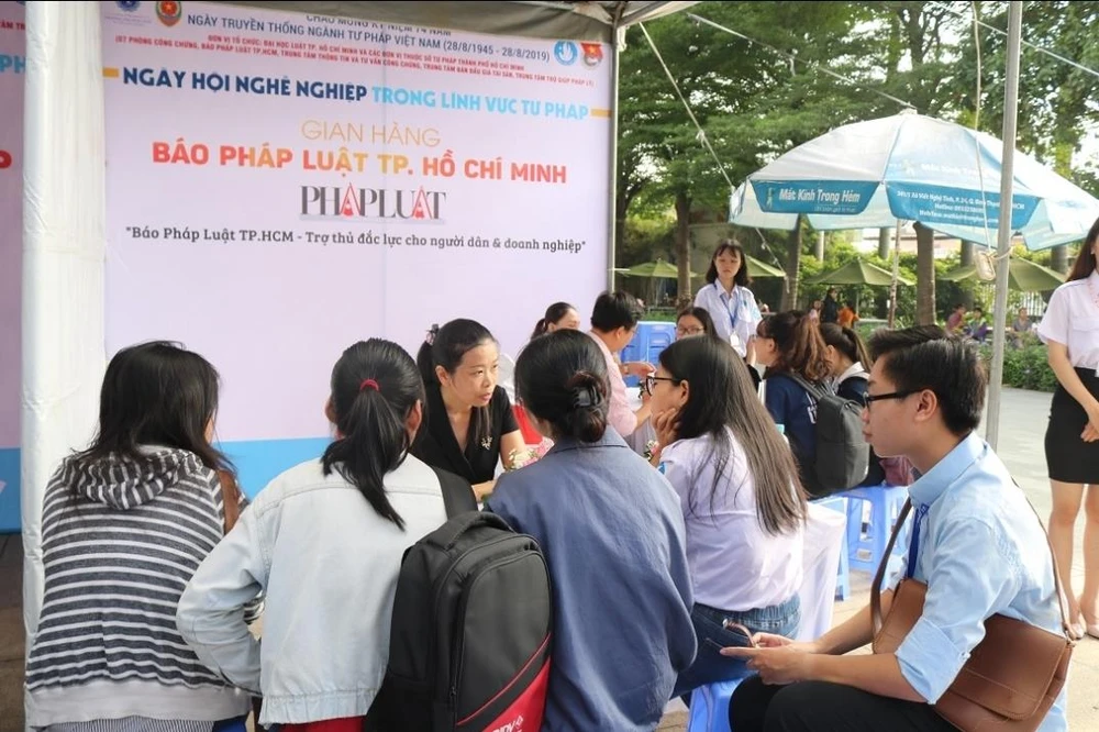 Gian hàng của báo Pháp Luật TP.HCM thu hút nhiều bạn sinh viên đến tư vấn về nghề báo
