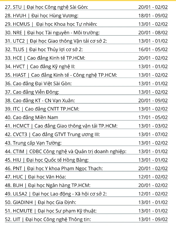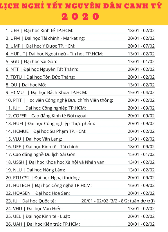 Lịch nghỉ tết Nguyên đán Canh Tý 2020 của một số trường ĐH-CĐ tại TP.HCM.