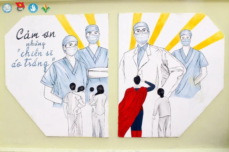 Điểm đặc biệt tại đây, thay vì chỉ sơn mới, chính các sinh viên đã tự tay vẽ phác họa và sơn những bức tranh “chiến sĩ áo trắng”, là hình ảnh các y bác sĩ lên bức tường của ký túc xá. Bên cạnh kèm dòng chữ "Cảm ơn những chiến sĩ áo trắng".