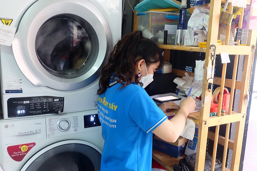 Kim Hồng tại cửa hàng giặt ủi. Ảnh: TÚ NGÂN
