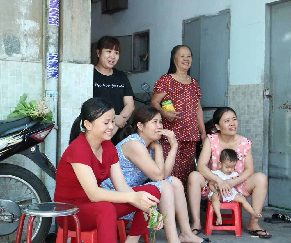 Nhiều công nhân ở khu lưu trú cùng tập trung để xem các con chơi. Qua đó có thêm kiến thức, cách phòng, chống dịch COVID-19. Ảnh: THANH TUYỀN