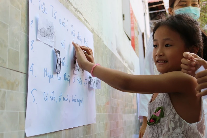 Một trò chơi áp dụng bài thơ 5 điều Bác Hồ dạy cho các em nhỏ hiểu thêm về virus Corona của đội ngũ y bác sĩ. Ảnh: THANH TUYỀN