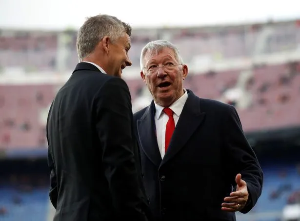 Sir Alex Ferguson trao đổi với HLV Ole Gunnar Solskjaer. ẢNH: DAILY STAR