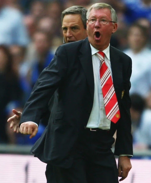 Sir Alex Ferguson bật chế độ máy sấy tóc rồi cười trừ trước sự lém lĩnh của hai anh em Fabio và Rafael. ẢNH: GETTY