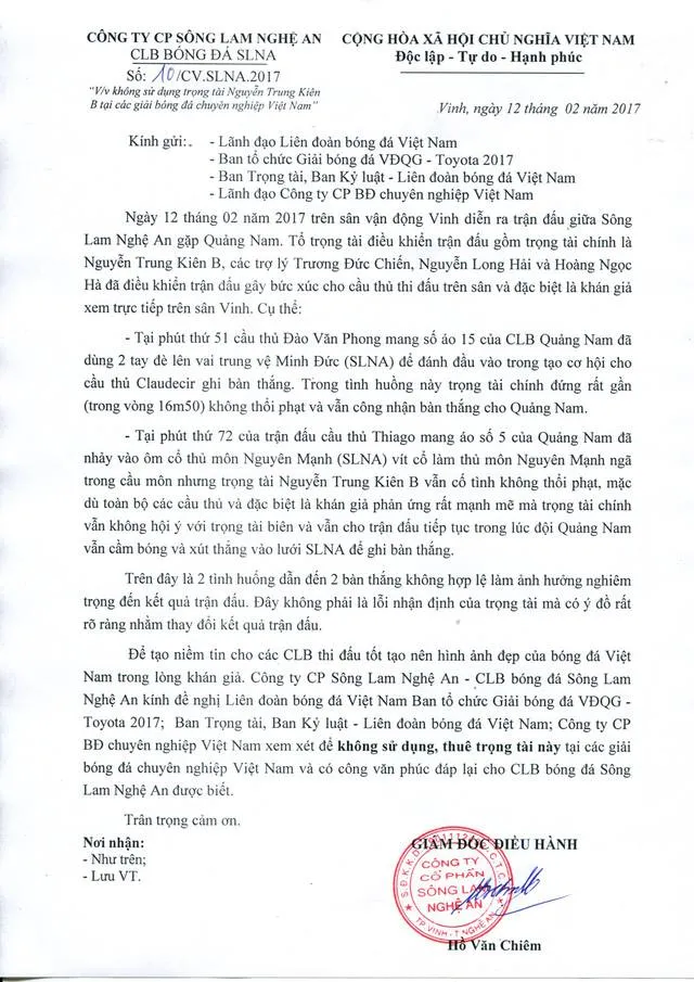 Công ty CP SL Nghệ An - CLB bóng đá SL Nghệ An kính đề nghị Liên đoàn Bóng đá Việt Nam, Ban tổ chức giải bóng đá VĐQG - Toyota 2017; Ban Trọng tài - Liên đoàn Bóng đá Việt Nam; Công ty CP BĐ chuyên nghiệp Việt Nam xem xét để không sử dụng trọng tài này tại các giải bóng đá chuyên nghiệp Việt Nam”.