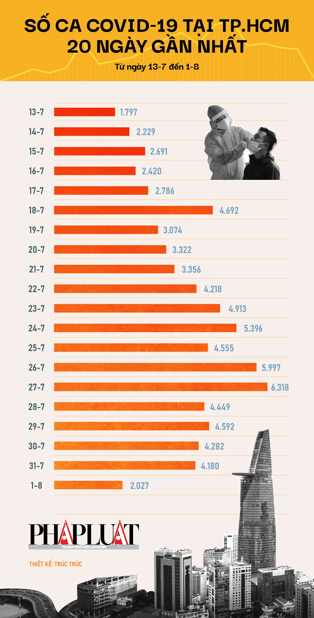 (PLO)- Dưới đây là thống kê số ca Covid-19 mỗi ngày trên địa bàn TP.HCM trong 20 ngày gần nhất (từ ngày 13-7 đến 1-8)