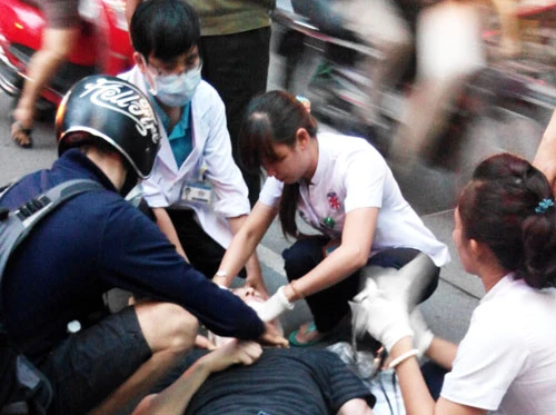 Sơ cứu nạn nhân giữa đường. Ảnh: An Nhơn.