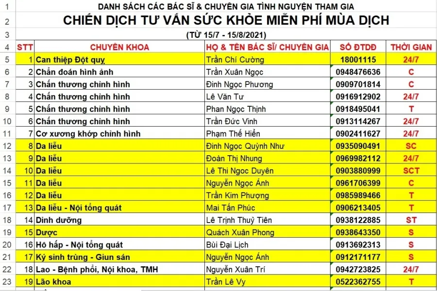 Mời bạn đọc xem danh sách, số điện thoại của các bác sĩ, chuyên gia của chiến dịch tư vấn sức khỏe miễn phí mùa dịch TẠI ĐÂY.