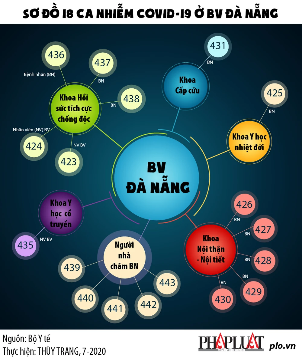 Cập nhật 29-7 COVID-19: 15 ca nhiễm mới kể từ ca 431 ở Đà Nẵng (PLO)- Trong 15 ca nhiễm COVID-19 mới ở Việt Nam (kể từ ca 431 ở Đà Nẵng) có đến 12/13 ca bệnh ở Đà Nẵng là bệnh nhân (BN), người nhà BN hoặc nhân viên của các Bệnh viện ở Đà Nẵng.
