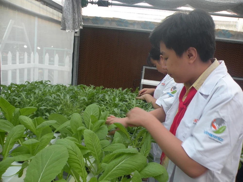 Học sinh trường THCS Phan Tân Hồ, quận Gò Vấp chăm sóc vườn rau theo công nghệ thủy canh. ẢNH: NGUYỄN QUYÊN