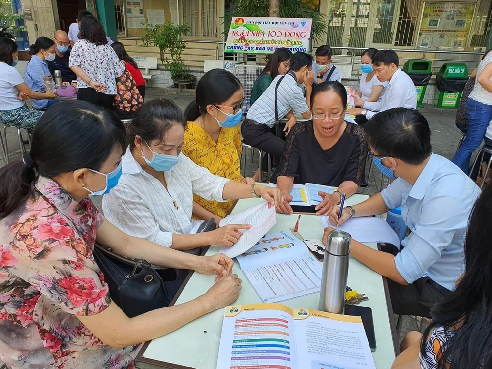 Các giáo viên trường Tiểu học Yên Thế, quận Tân Bình lựa chọn SGK. Ảnh: NTCC