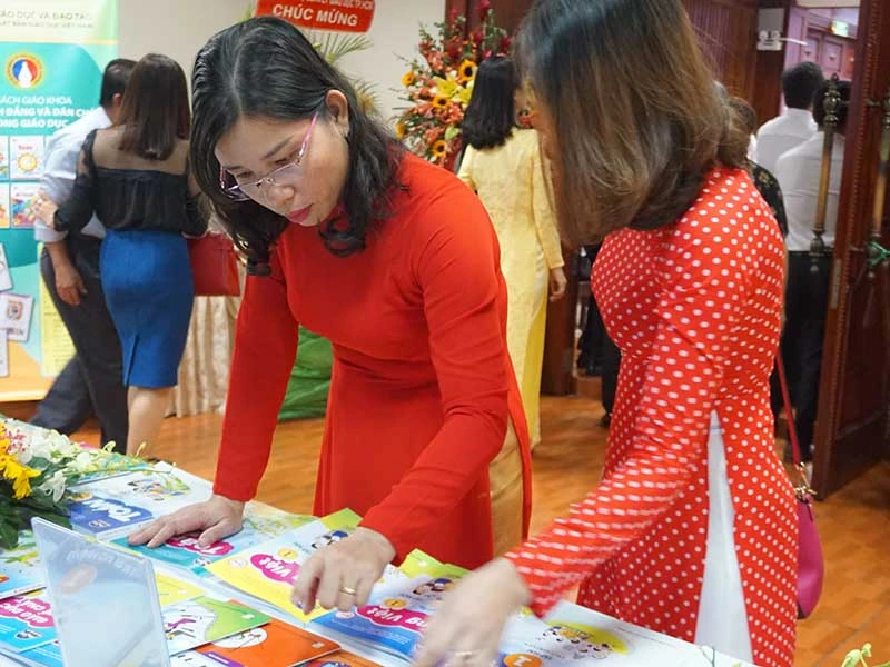 Đại biểu xem bộ sách Chân trời sáng tạo được trưng bày tại lễ kỷ niệm 40 năm thành lập NXB Giáo dục Việt Nam tại TP.HCM. Ảnh: Nguyễn Quyên