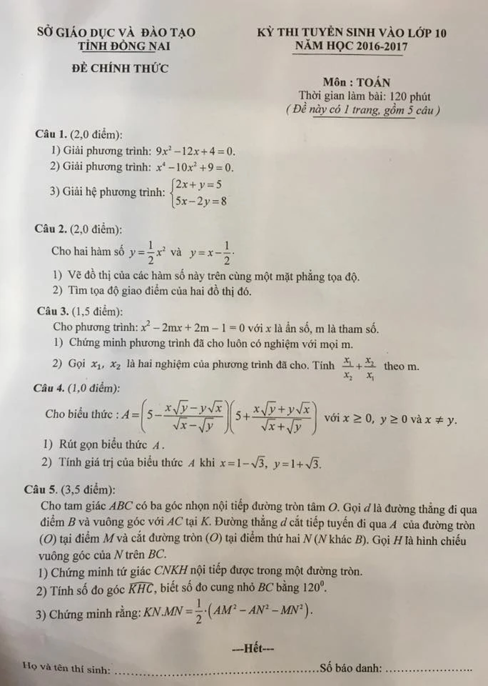 Ngày 10-6, nhiều cơ quan truyền thông đưa tin ngay sau buổi thi môn toán trong kỳ thi tuyển sinh vào lớp 10 THPT của tỉnh Đồng Nai năm học 2016-2017 diễn ra sáng 9-6, nhiều thí sinh và giáo viên phản ánh có sai sót trong đề thi môn này.
