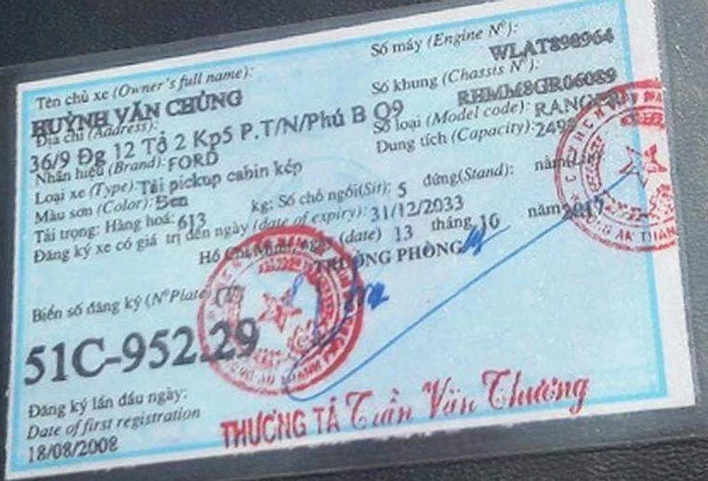 Trong một diễn biến khác, theo hồ sơ, ông Chủng được phòng cảnh sát giao thông đường bộ (trước là PC 67, Công an TP.HCM) cấp giấy chứng nhận đăng ký xe bán tải biển số 51C - 952.29