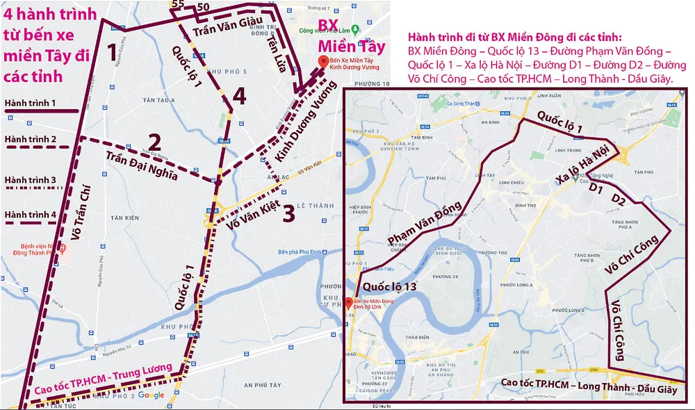 Ông Đỗ Ngọc Hải, Trưởng phòng Quản lý vận tải đường bộ, Sở GTVT, cho biết để tránh tình trạng ùn tắc trước Bến xe Miền Tây, Bến xe Miền Đông, Sở GTVT đưa ra lộ trình dự phòng cho xe ra khỏi các bến như sau.