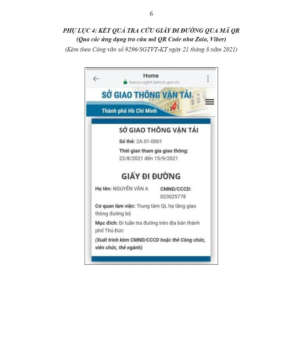 Mỗi giấy đi đường khi tra cứu mã QR (qua các ứng dụng tra cứu như Zalo, Viber…) sẽ thể hiện các thông tin: Cơ quan làm việc, họ tên người được cấp, số CMND/CCCD, mục đích và thời gian tham gia giao thông (theo phụ lục 4).