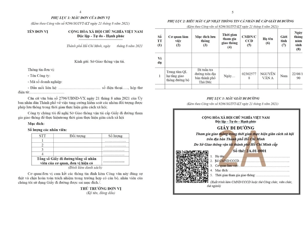 Các cơ quan, đơn vị nêu trên có Công văn (theo Phụ lục 1), kèm danh sách cán bộ, công chức, viên chức, người lao động cần lưu thông để phục vụ nhiệm vụ cấp thiết để cấp giấy đi đường theo mẫu phụ lục 2 đính kèm ( kèm tập tin theo ứng dụng Excel định dạng xls), gửi về Sở GTVTqua hộp thư điện tử (sgtvt@tphcm.gov.vn) để được cấp giấy đi đường.