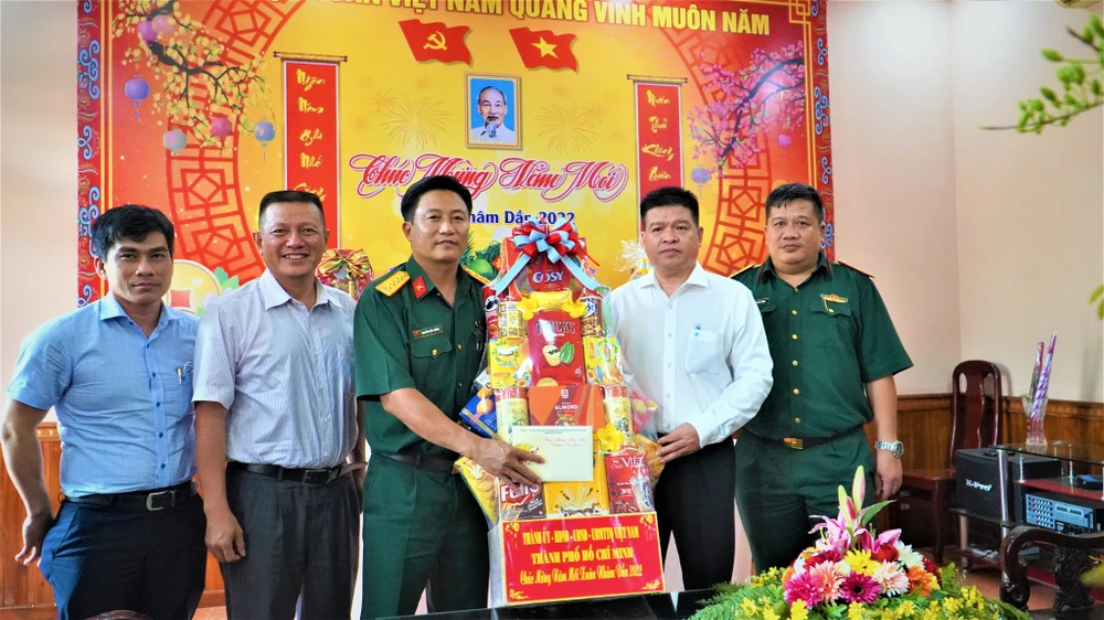 Điểm đến đầu tiên của đoàn là Sư đoàn 9 (tại huyện Củ Chi, TP.HCM). Tại đây, ông An gửi lời tri ân đến các chiến sĩ bộ đội Cụ Hồ đã tham gia, đồng hành, chia sẻ, giúp đỡ TP trong công tác phòng chống dịch, nhất là vào thời điểm TP gặp khó khăn nhất.