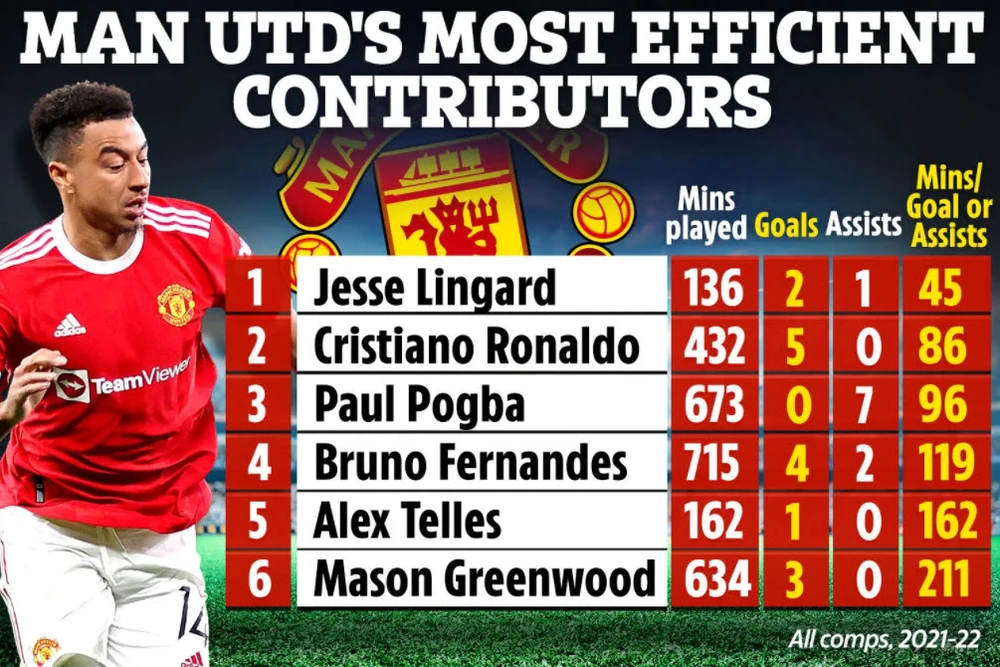 Thống kê về độ hiệu quả ở MU với Lingard đứng đầu. ẢNH: THE SUN