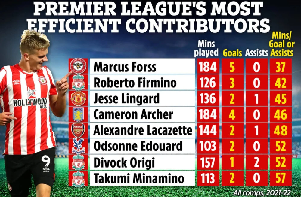 Đứng đầu Premier League là Marcus Forss của Brentford với 5 bàn thắng, đạt hiệu suất 34 phút mỗi bàn. Roberto Firmino hiệu quả thứ hai với 42 phút là anh lại ghi 1 bàn thắng cho Liverpool. Đứng thứ tư là Cameron Arche của Aston Villa với 4 bàn thắng, hiệu suất 46 phút mỗi bàn.