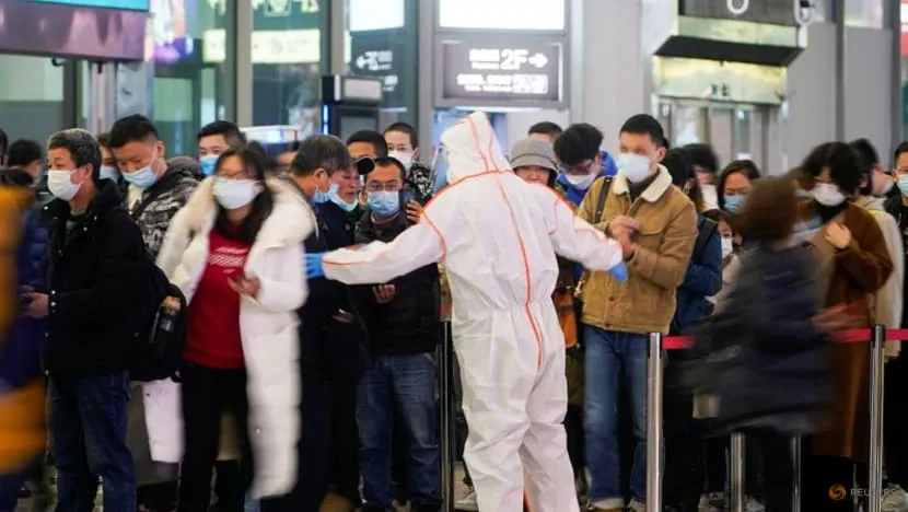 Nhân viên bảo vệ chặn lối ra trong lúc hướng dẫn người dân quét mã QR để khai báo tình trạng sức khỏe của họ tại ga xe lửa Hồng Kiều ở Thượng Hải, Trung Quốc, ngày 25-11. Ảnh: REUTERS