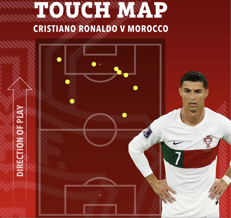 Ronado có số liệu thống kê không ấn tượng trong trận Bồ Đào Nha thua Morocco ở tứ kết World Cup 2022. ẢNH: SUN SPORTS |