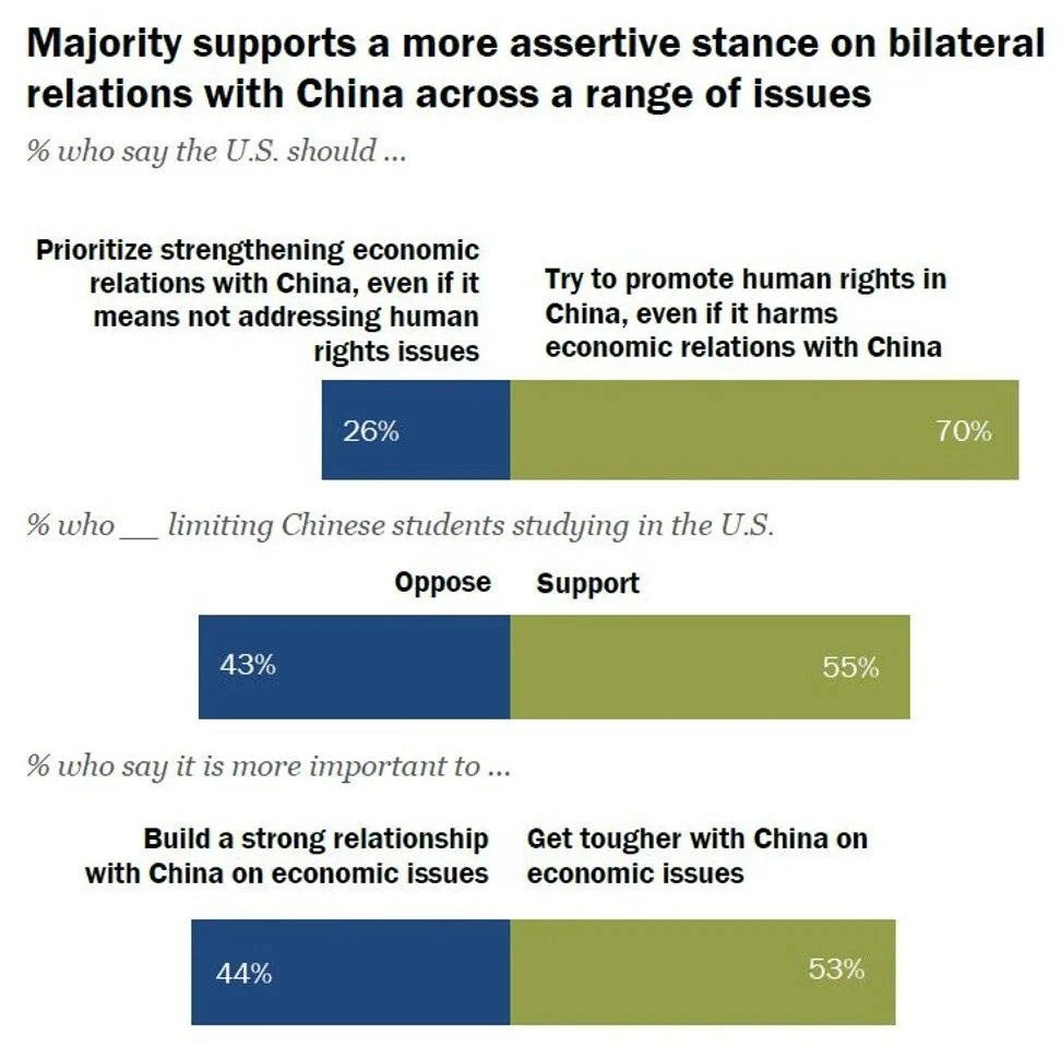 Ngoài ra, 55% số người được khảo sát cũng ủng hộ việc hạn chế sinh viên Trung Quốc du học tại các trường đại học ở Mỹ, một việc có thể gây tổn hại cho việc cải thiện quan hệ nhân dân hai nước.