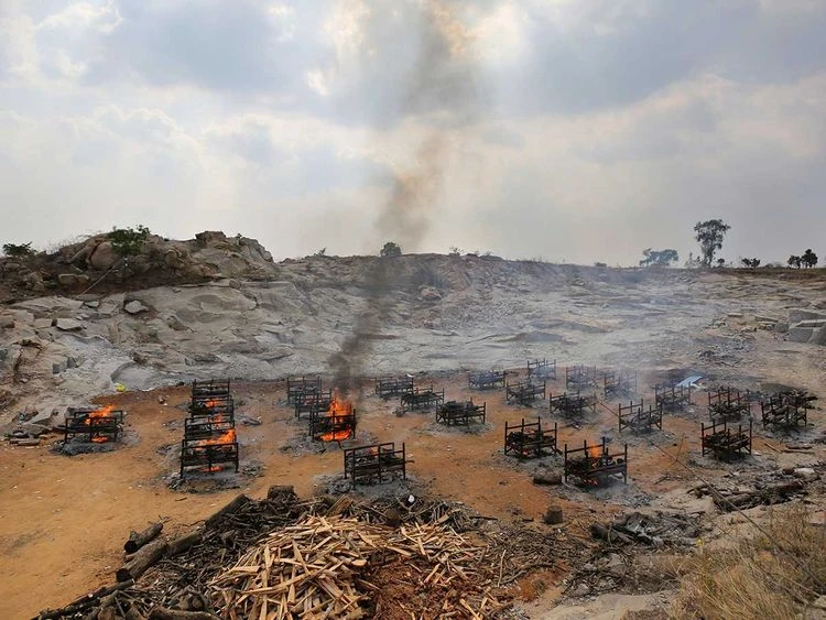 Giàn hỏa thiêu cácnạn nhân COVID-19 trong một lò hỏa táng lộ thiên được thiết lập tại một mỏ đá granit ở ngoại ô Bengaluru, Ấn Độ, hồi tháng 5. Ảnh: AFP