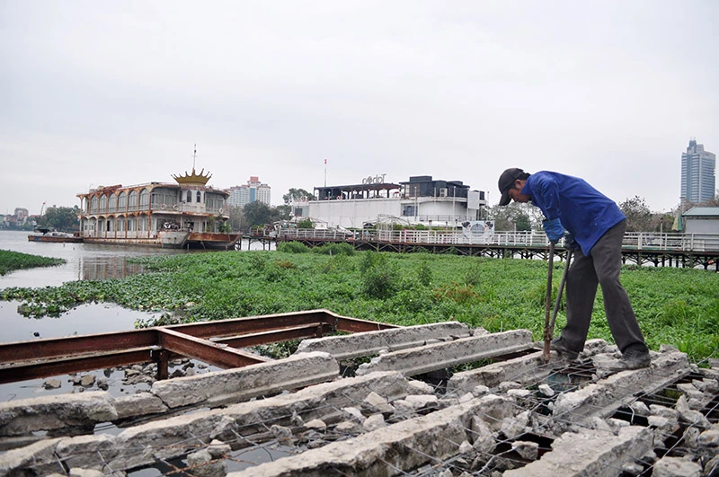 Sàn nổi dẫn xuống một nhà hàng nổi tại khu vực bến thủy Hồ Tây (đường Nguyễn Đình Thi) đang bị công nhân phá dỡ.