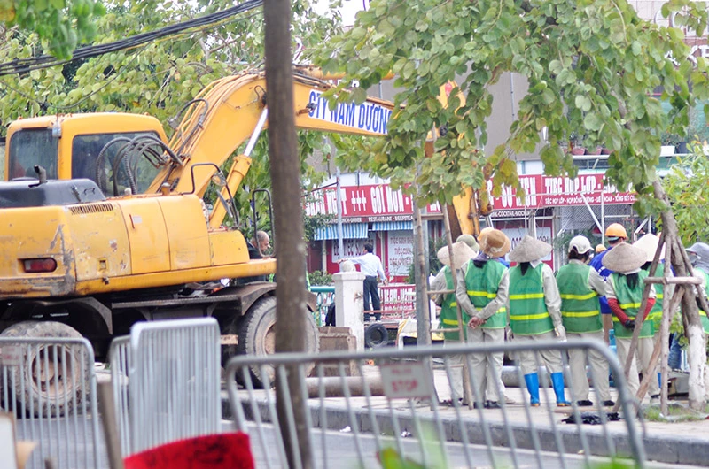 Máy xúc, nhiều phương tiện và hàng trăm người được huy động để cưỡng chế cầu dẫn, sàn nổi của các nhà hàng, du thuyền tại bến thủy Hồ Tây.