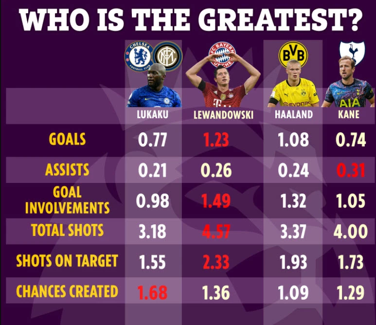 Xét về số bàn thắng, Lukaku đạt hiệu suất trung bình kém hơn Robert Lewandowski (Bayern Munich) và Erling Haaland (Borussia Dortmund) nhưng anh lại tạo ra nhiều cơ hội hơn hai ngôi sao của giải Bundesliga và cả Harry Kane (Tottenham).