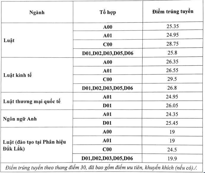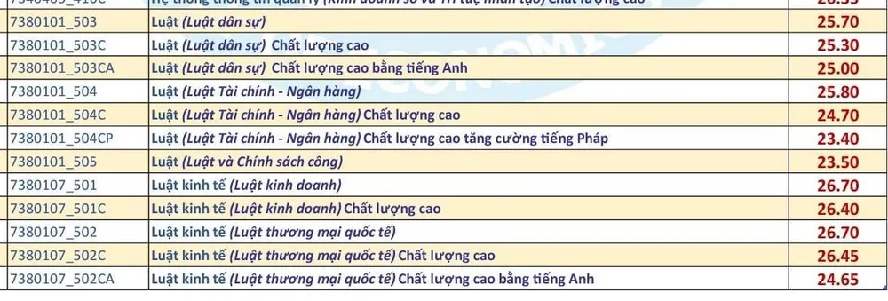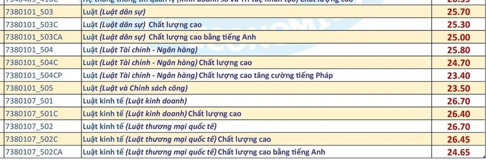 Còn tại Trường ĐH Kinh tế Luật (ĐH Quốc gia TP.HCM), điểm chuẩn của 12 ngành luật cũng khá cao, từ 23,4 đến 26,7 điểm, tức mỗi môn trong tổ hợp phải từ gần 8 điểm trở lên mới có thể trúng tuyển. Điểm từng ngành như sau: