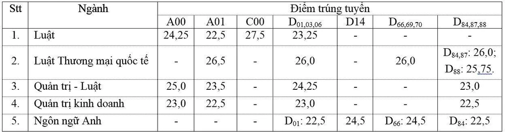 Điểm chuẩn của 5 ngành theo các tổ hợp xét tuyển năm nay của trường khá cao, dao động từ 22,5 đến 27,5 điểm. Ngành có điểm cao nhất là ngành Luật ở tổ hợp C00 (văn, sử, địa) với 27,5 điểm.