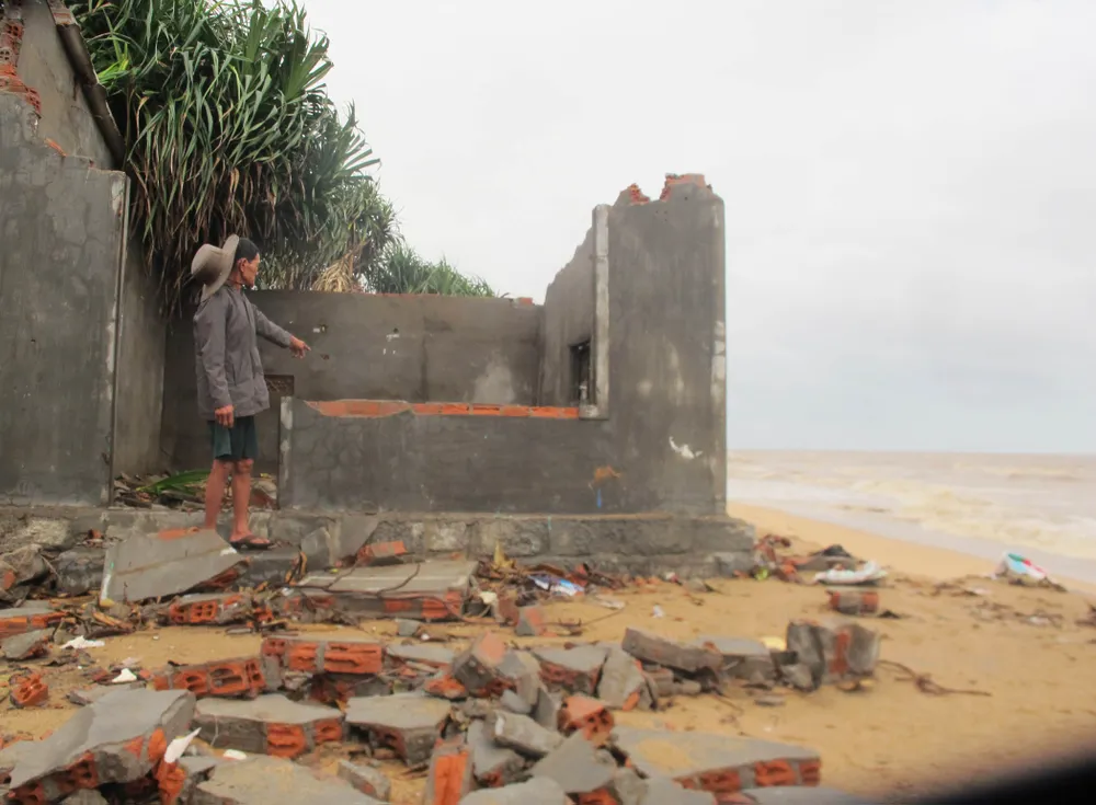 Vào ban đêm, sóng lớn xâm thực sâu vào đất liền, làm hư hỏng nhiều ngôi nhà khiến những gia đình này phải khẩn cấp sơ tán, di chuyển tài sản đi nơi khác. “Cả nhà tôi đang ngủ thì sóng ập vào, phá vỡ một góc sân. Ngay trong đêm, cả nhà tôi phải vội vàng đến nhà người thân trú tạm nếu không đã bị sóng cuốn ra biển hết rồi. Gia đình tôi mới dùng 50 bao cát đắp bờ bảo vệ ngôi nhà, giờ đã bị sóng cuốn sạch ra biển” - anh Trần Văn Cầm, có nhà bị sóng đánh hư hỏng, kể.