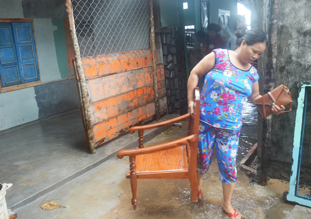 Người dân đóng cửa nhà, mang tài sản đi sơ tán do nước biển đã tràn vào sân. Ảnh: TẤN LỘC