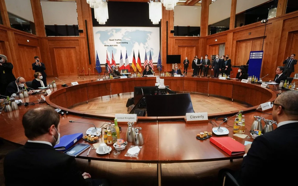 Quan chức Mỹ và Đức làm việc trong chuyến thăm của Ngoại trưởng Mỹ Antony Blinken hôm 20-1. Ảnh: AFP