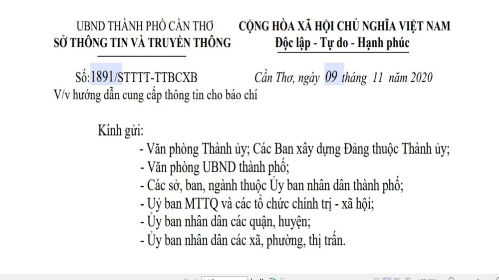 Công văn về việc hướng dẫn cung cấp thông tin cho báo chí của Sở TT&TT TP Cần Thơ. Ảnh: NN